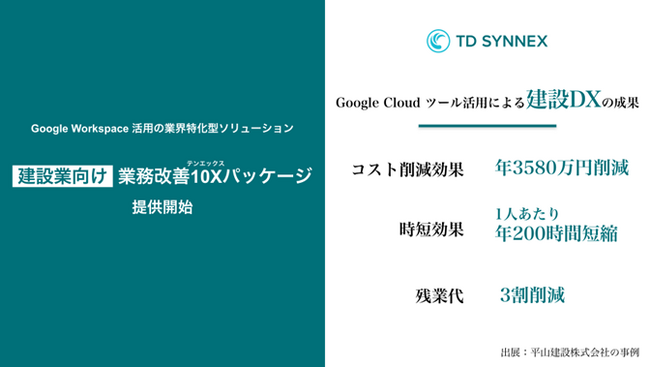 TD SYNNEX株式会社(本社:東京 代表取締役社長:國持重隆、以下「TD SYNNEX」)は、建設業界の業務効率化と生産性向上を目的として、Google Workspace を活用した【建設業向け】業務改善10Xパッケージを提供開始することをお知らせいたします。本ツールを使用することで、建設業界の業務プロセスが大きく革新され、画期的な効率化を達成することが期待されます。