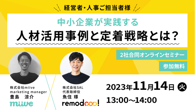 組織の活性化を実現する、福利厚生プラットフォームを提供する株式会社miive(本社:東京都渋谷区、代表取締役:栗田廉)は 、Web制作事業・在宅チーム構築支援事業を行う株式会社サル(東京都品川区、代表取締役:魚住 琢)と2023年11月14日(火)に中小企業が実践する人材活用事例と定着戦略とは?と題したオンラインセミナーを開催することをお知らせいたします。