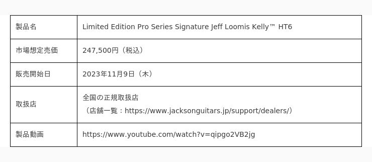 フェンダー ミュージカル インストゥルメンツ コーポレーション(所在地:米国 カリフォルニア、CEO アンディ・ムーニー、以下FMIC)は、エレキギター/ベースブランドのJackson(R)︎よりモダンメタルレジェンドのジェフ・ルーミスの最新シグネイチャーギター『Limited Edition Pro Series Signature Jeff Loomis Kelly(TM) HT6』を発表しました。本製品は、2023年11月9日(木)より販売を開始します。