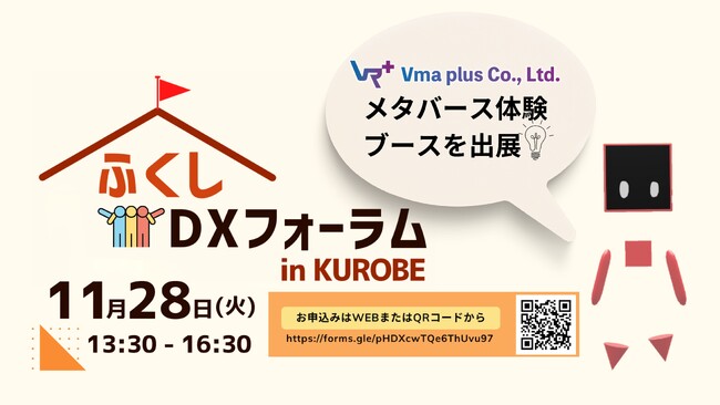 メタバースWeb3のコンテンツ企画・ディレクションを行うVma plus(ブイマプラス)株式会社(本社:東京都品川区、代表:津田徹)は、2023年11月28日にふくしDXフォーラムin KUROBEにて、ブラウザ型メタバース『Vma plus Station』を体験できるブースを出展します。