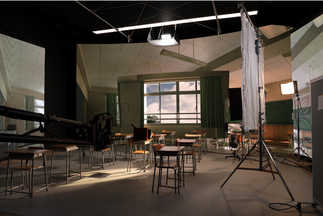 『ひとひらの初恋』スタジオ撮影風景 机はリアル、壁と窓の景色は3DCG