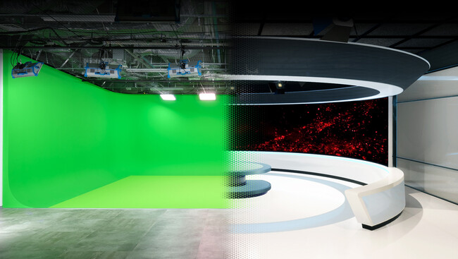 バーチャルプロダクション(VP)とは、グリーンバックや大型LEDディスプレイを背景に使い、3DCG(3次元CG)などで作った仮想背景と、位置情報センサーを取り付けたカメラで撮影したリアルな映像を合成する最新技術です。