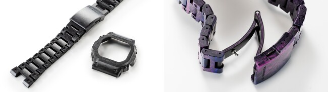 複雑な形状を構成するため、ケース・ベゼル・バンド・中留それぞれに適したカーボンを使い分けることで、ステンレス採用のフルメタルモデル「GMW-B5000D」(約167g)に対し約65gと61%の軽量化※1を実現しました。