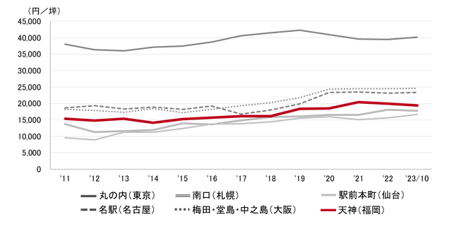 <募集賃料の推移(6大都市 大規模ビル・主要駅前地区)>