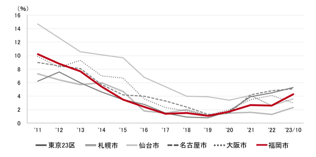 全規模ビル 主要エリア 空室率:「博多駅前」6ヵ月連続で低下し、2022年12月以来の3%台へ