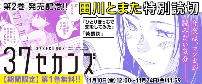 国内外の映画祭で受賞多数の傑作映画をコミカライズした『37セカンズ』(原作:HIKARI/漫画:栗原 陽平)第2巻が、11月9日に新潮社より刊行しました。新刊発売を記念して、くらげバンチに漫画家・田川とまた氏の特別読切が掲載されるほか、期間限定で第1巻を無料公開中です。