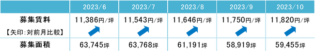 募集賃料は前月比プラス70円/坪の11,820円/坪となった。6ヵ月連続の上昇となり、統計開始以来の最高値更新が続いている。