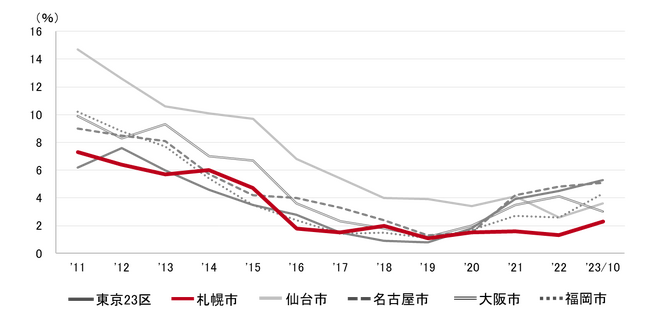 三幸エステート株式会社(本社:東京都中央区、取締役社長:武井重夫)は、2023年10月度の札幌市オフィス賃貸状況(空室率&現空面積:全規模、募集賃料&募集面積:全規模、規模別空室率、主要エリア※1空室率:全規模)および全国6大都市(東京・札幌・仙台・名古屋・大阪・福岡)の大規模ビルのマーケットデータをまとめた 「オフィスマーケット2023年11月号 札幌」を公表します。