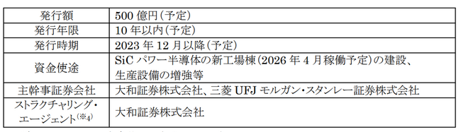 グリーンボンドとは、企業や地方自治体等の発行体が、国内外の適格なグリーンプロジェクトに要する資金を調達するために発行する債券です。本社債の発行により調達する資金は、SiCパワー半導体の新工場棟(2026年4月稼働予定)の建設や生産設備の増強等(※1)に充当します。