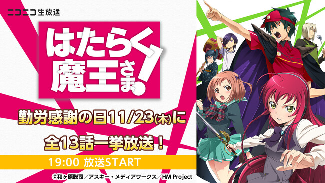 株式会社ドワンゴは、ライブ配信サービス「ニコニコ生放送」にて、11月23日の“勤労感謝の日”にちなみ、アニメ『はたらく魔王さま!』の全13話を同日2023年11月23日(木)19時より無料一挙放送します。