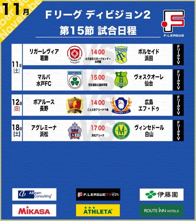 11月11日(土)、12日(日)にFリーグ2023-2024 ディビジョン2 第15節の3試合を開催いたします。