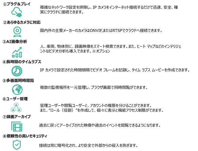 通常はオンプレミス型の機器でしか実現できない画像解析機能をクラウドサービスとして提供することで、環境的に録画機を設置できない飲食店やアパート・マンション、土木・建設現場にもAI画像解析を活用した現場のDX実現を支援します。