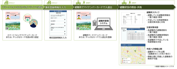 避難所名簿や避難所への入退管理をデジタル化し、災害時はタイムリーに官民で情報連携を、平時においても地域イベントなどで利用可能な仕組みをめざします。具体的には、現地での混雑緩和のため、事前に市民がマイナンバーカードによる本人確認の上スマートフォンなどから事前登録情報の登録を行い、マイナンバーカードをかざすだけで入退出処理を行うものです。本システムはテレネット株式会社のらくらく避難所くん*9をベースに提供します。