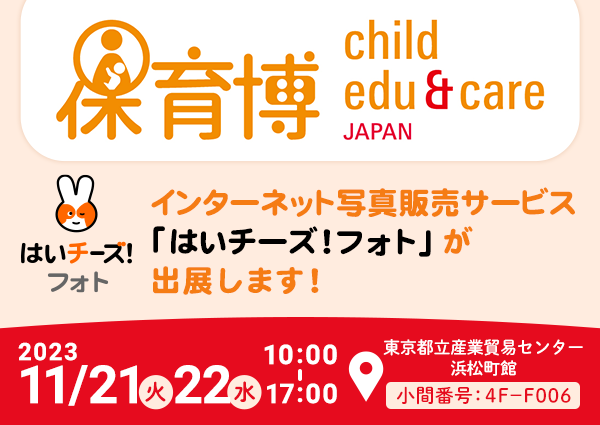 「保育博ウエスト2023」で当社は、インターネット写真販売「はいチーズ!フォト」をはじめとする総合保育テックサービス「はいチーズ!」シリーズをご紹介します。