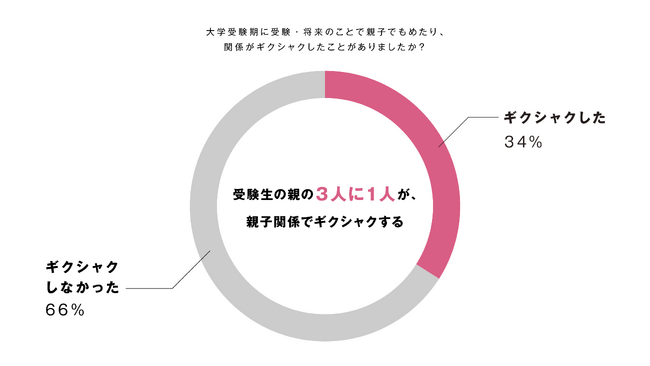 大学生の子どもがいる、かつ、子どもの大学受験に対して真剣に取り組んだと答えた親に、受験期の親子関係について尋ねたところ、34%がギクシャクしたと答えました。