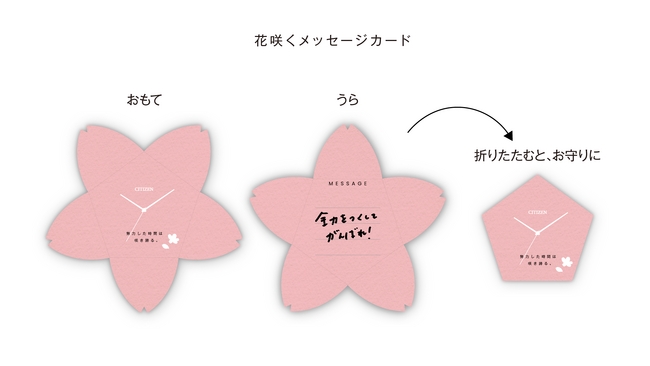 シチズンフラッグシップストア、またはシチズンウオッチオフィシャルサイトで受験生への贈り物として腕時計をご購入いただいた方に、シチズンオリジナル「花咲くメッセージカード」をプレゼントします。