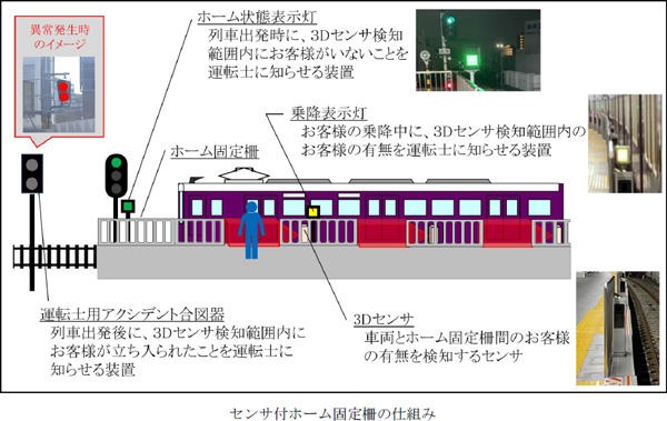 今回、ワンマン運転を実施する線区には、センサ付ホーム固定柵を設置します。センサ機能によって、車両とホーム固定柵の間のお客様の有無を検知し、安全を確認した上で列車が出発できるシステムにしています。