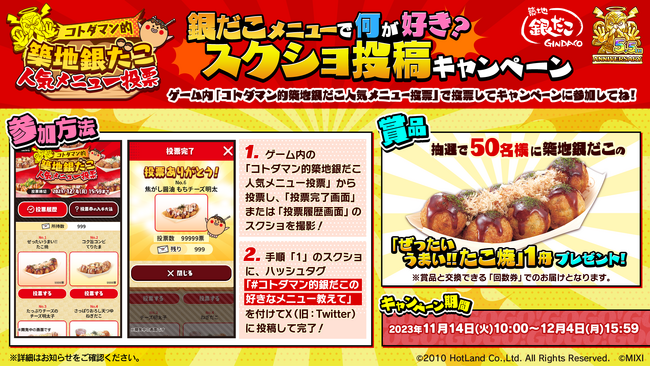 「投票完了画面」または「投票履歴画面」のスクリーンショットとハッシュタグ「#コトダマン的銀だこの好きなメニュー教えて」を付けて、X(旧Twitter)に投稿した方の中から抽選で50名様に「ぜったいうまい!! たこ焼」1舟をプレゼントします。