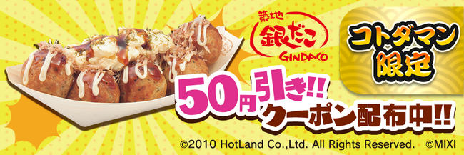 さらに、「コトダマン的築地銀だこ人気メニュー投票」の開催を記念して、「築地銀だこ」のたこ焼人気メニューが50円引きになるコトダマンユーザー限定の特別クーポン「コトダマン限定 築地銀だこクーポン」※2をプレゼントします。
