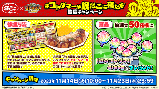 また、全国の「築地銀だこ」店舗に掲出されているPOP、または「築地銀だこ」のたこ焼の写真と、ハッシュタグ「#コトダマンが銀だこに来たぞ」を付けてX(旧Twitter)に投稿した方の中から抽選で50名様に虹のコトダマ400個をプレゼントします。
