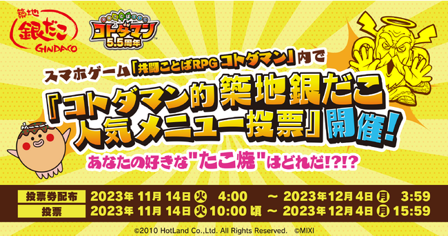 株式会社MIXI(東京都渋谷区、代表取締役社長CEO:木村 弘毅)は、スマホアプリの「ことば」で闘う新感覚RPG「共闘ことばRPG コトダマン」(以下コトダマン)において、本年11月14日(火)より、株式会社ホットランド(東京都中央区、代表取締役社長:佐瀬 守男)が展開するたこ焼チェーン「築地銀だこ」(以下築地銀だこ)との初コラボイベント「コトダマン的築地銀だこ人気メニュー投票」を開催します。