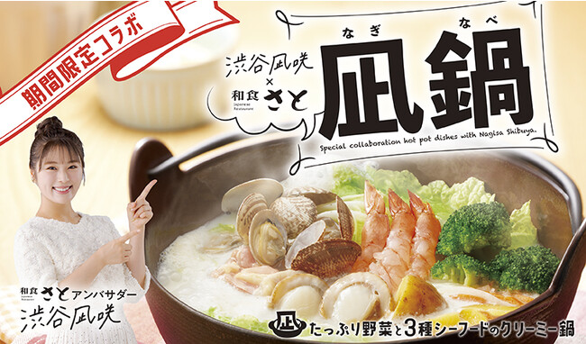 国内197店舗を展開する「和食さと」では、アンバサダー渋谷凪咲さんとのコラボメニュー『凪鍋(なぎなべ)』と題して、「たっぷり野菜と3種シーフードのクリーミー鍋」を11月14日(火)から12月25日(月)までの期間限定で販売します。