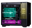 ミニタワーサイズの筐体は長さ280mmまでのグラフィックカードを搭載可能。大型グラフィックスカード搭載時には、しっかりと支えるグラフィックスカードホルダーも取り付けいたします。また筐体の上面には120mmのケースファンを2基、あるいは240mmの水冷クーラーを搭載可能。背面と底面には120mmのケースファンを各1基設置することが可能となっており、ミニタワーを超えた冷却性能を実現します。