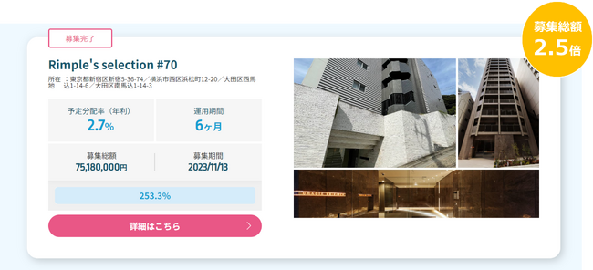 プロパティエージェントの展開する不動産クラウドファンディング Rimple‘s Selection#70 募集総額253.3%の1.9億円の応募