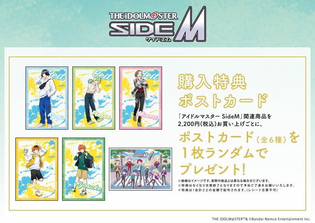 『アイドルマスター SideM』の関連商品を1会計2,200円(税込)お買い上げごとに、ポストカード(全6種)をランダムで1枚プレゼントいたします! 描き下ろしイラストver.もGraffArtイラストver.も両方欲しくなってしまう、限定デザインです……!!