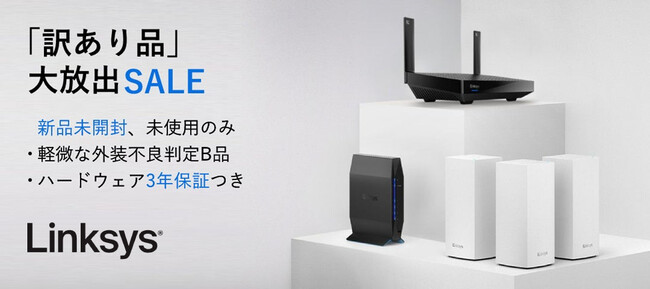 Linksys(リンクシス)はこのたび新品未開封の訳あり品大放出セールを開催します。流通過程で箱の角が1mm程度凹んでしまったものや、外装シュリンクラップの破れ、パッケージ破れ等、中身の商品には一切問題ないものの、外装不良によりB品判定となった商品を大放出します。