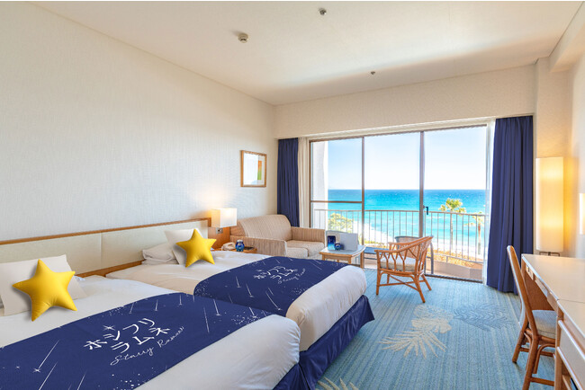 各ホテルに1室ずつ、コラボレーションルームが登場します。ホシフリラムネ瓶を使ったランタンや、ホシフリラムネ仕様のベッドスロー、星形のクッションなど、ホシフリラムネのエモーショナルな世界観に浸れるインテリアで彩った空間で、リラックスしてお過ごしいただけます。