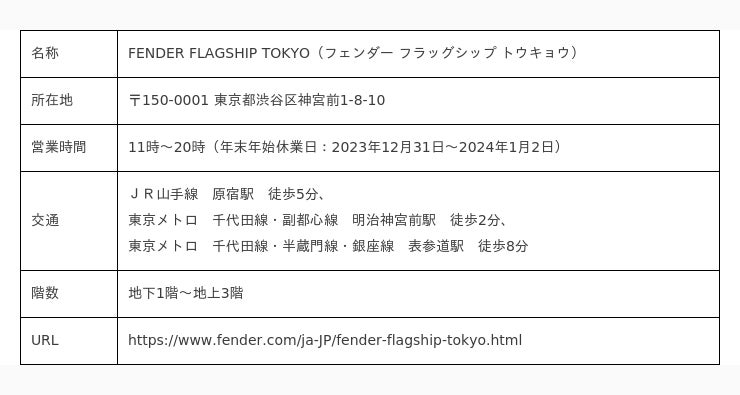 フェンダー旗艦店「FENDER FLAGSHIP TOKYO」施設概要