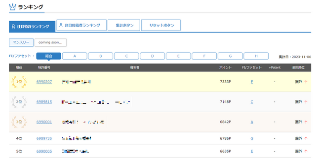 また、閲覧、投稿、いいね、ブックマークなどに基づいて特許発明ごと、投稿者ごとにポイントを付与し、獲得したポイントに基づいて、各特許発明の注目度、投稿者の注目度をランキング化し、「Patepedia」の「ランキング」ページで、デイリー、ウィークリー、マンスリーで、注目度の順に表示します。