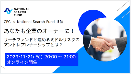 サーチファンドで“本音で生きる事業家を増やし、期待と熱量に満ちた世界“を目指すNational Search Fund株式会社(代表取締役 Founder:山根 孝、 以下「NSF」)が、グロービス経営大学院の公認クラブで起業家や起業家を目指す人たちによって運営されているグロービス・アントレプレナーズ・クラブ(以下、GEC)と共同で、サーチファンドの理解や事業承継への興味関心を高めることを目的に、クラブ会員向けに企業オーナーを目指す人のためのアントレプレナーシップセミナーを開催します。