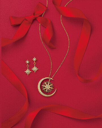 冬の夜空を明るく照らしてくれる月と、その輝きをさらに引き立てる一番星をイメージしたネックレスとピアス。ネックレスの表側はカットガラスをふんだんに散りばめ、煌びやかで上品な印象。裏側はブラックカラーを基調とし、シックでミステリアスに。リバーシブルで着用可能です。それぞれのパーツはチェーンから引き抜くことができ、スタイルに合わせてアレンジが可能です。