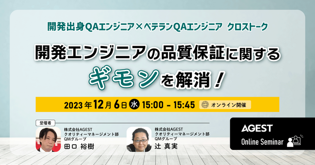 先端品質テクノロジーを活用してソフトウェアの品質・安全性向上を支援する株式会社AGEST(本社:東京都文京区、代表取締役 社長執行役員 CEO: 二宮 康真、以下「AGEST」)は、2023年12月6日(水)に、ソフトウェアの品質について興味がある開発エンジニア向けの無料オンラインセミナー「開発エンジニアの品質保証に関するギモンを解消!~開発出身QAエンジニア×ベテランQAエンジニア クロストーク~」を開催することをお知らせいたします。