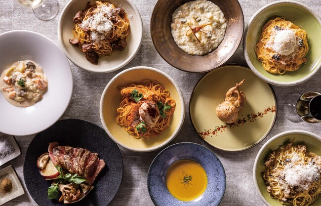 渡り蟹とオマール海老のグリルがのった冬のごちそうメニュー「オマール海老と渡り蟹のクリームスパゲッティーニ」が2年振りに復活。手打ち生ニョッキの柔らかい食感がクリームソースと絡む「じゃがいもの手打ちニョッキ サーモンクリーム」、赤ワインでじっくり煮込んだ肉感溢れる「牛肉ラグーとセロリのボロネーゼ」、さわやかなりんごの酸味とゴルゴンゾーラが絶妙にクセになる「ゴルゴンゾーラとりんごのリゾット」など、KIHARUならではのアイデア光る、本格的で手仕込みの温もりを感じる新作パスタをご用意します。