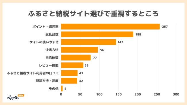 最多は「ポイント・還元率」で257人。回答者の66%が重視していました。利用者数で1位だった「楽天ふるさと納税サイト」ではSPU(スーパーポイントアッププログラム)などのキャンペーンを組み合わせると最大30.5%還元、2位の「さとふる」はPayPayポイント30%還元キャンペーンなどを実施しています。ポイント還元率の高さが、利用者数にも表れています。