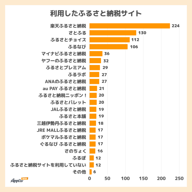 最多は「楽天ふるさと納税」で224人。回答者の過半数が利用していました。その後に「さとふる」130人、「ふるさとチョイス」112人、「ふるなび」106人が続きます。