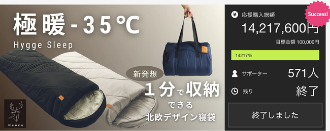 2022年11月Makuakeにて実施した寝袋「ヒュッゲスリープ 3400」プロジェクト(第1弾)では、サポーター571人、1,421万円(達成率14,217%)と多くの方に応援いただきました。