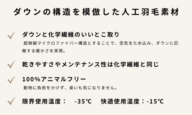 人工ダウンでぼっかぼかの暖かさ。手軽に洗濯も可能