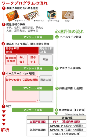 関与あり群が体験する「おやつに関与するワークプログラム」は、おやつを通して日常かつ自然に行われている活動である、「商品の背景について知ること」「人と分け合うこと」「人にプレゼントすること」により構成されています。これらの活動を、おやつを活用しながら1ヶ月間意識的に活動していただくことにより、心理的ウェルビーイングや主観的ウェルビーイングにどのような変化があるかを、ポジティブ心理学の研究で用いられる評価尺度を使用して測定しました。また、ウェルビーイングの変化量について、関与なし群との比較も行いました。