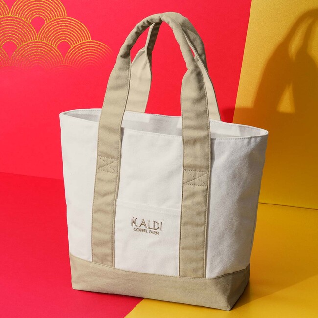 福袋限定のオリジナル商品や、和食材ブランド「もへじ」の干支商品をはじめ、カルディコーヒーファームの人気商品が入っています。丈夫なキャンバス生地のトートバッグには、便利な内ポケットと外ポケットがついています。開け口はファスナーが付いていて、荷物をしっかりとしまうことができます。