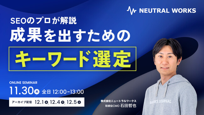 デジタルマーケティング支援事業を展開する、株式会社ニュートラルワークス(神奈川県茅ヶ崎市 代表取締役:三木五月、以下 ニュートラルワークス)は、無料オンラインウェビナー「SEOのプロが解説 成果を出すためのキーワード選定 」を11月30日(木) 12時より実施いたします。