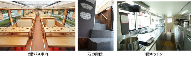移動と食の融合により新たな感動体験を提供する「レストランバス」は、1階にキッチン、2階には対面式の座席とテーブルを備え、透明で開閉可能なオープンルーフは開放感があり、いつもと違う目線から眺める景色と、本格的な料理をお楽しみいただけます。