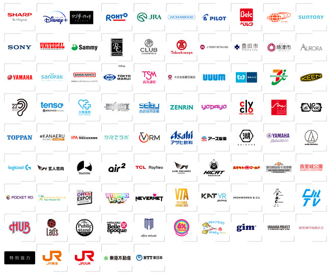 シャープ株式会社/ディズニープラス「ワンダーハッチ -空飛ぶ竜の島-」/ロート製薬株式会社/日本中央競馬会(JRA)/株式会社JVCケンウッド/株式会社パイロットコーポレーション/株式会社ベルク/株式会社ビームス/サントリー株式会社/ソニー株式会社/株式会社ユニバーサルエンターテインメント/サミー株式会社/株式会社Robot Consulting/株式会社クラブコスメチックス/株式会社高島屋/J.フロント リテイリング株式会社/愛知県豊田市/静岡県焼津市/オーロラ株式会社/ヤマハ発動機株式会社/日本サニパック株式会社/株式会社バンダイナムコミュージックライブ/株式会社東京マルイ/SO.ON project LaV 東京スクールオブミュージック&ダンス専門学校 高等課程/株式会社大丸松坂屋百貨店/UUUM株式会社/東京地下鉄株式会社/株式会社セブン&アイ・ホールディングス/キーン・ジャパン合同会社/株式会社ニッポン放送『ラジオ・チャリティ・ミュージックソン』/tenso株式会社/株式会社 大賀薬局/聖飢魔II/渋谷税務署/西武信用金庫/株式会社ゼンリン/YoDayo AI / Syr Corp/合同会社クリクロ/アークシステムワークス株式会社/株式会社diVRse/TOPPAN株式会社/かなプロマーケット/独立行政法人情報処理推進機構/かえでラボ/一般社団法人VRMコンソーシアム/アサヒ飲料株式会社/アース製薬株式会社/株式会社湖池屋/ヤマハ株式会社/株式会社オーディオテクニカ/Logicool G/玄人志向/Bauhutte(バウヒュッテ)/Xreal(Nreal)/TCL RayNeo/GALAKURO GAMING/HICAT/おきなわワールド文化王国・玉泉洞/那覇市国際通り商店街/首里城公園/株式会社PocketRD/株式会社名護パイン園/OffKai Expo/BitSummit/Nevermet(C)/Mythic Talent/株式会社EG/有限会社アイアンワークス/株式会社FBC/株式会社サイバーメディアTV/株式会社ハブ/Lad's Garage 渋谷店/株式会社セクションエイト/株式会社オフィス・ミツキ/ベルエポック美容専門学校/6%DOKIDOKI/アプラクティスド ハンド/株式会社ジム/#ウラハラプロジェクト/原宿神宮前商店会