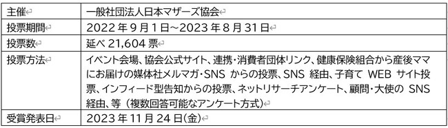 ママ・パパたちの記憶に残る商品やサービスを自然想起で投票いただくもので、商品やサービスに特別な愛着や、信頼感があるからこそ、他のママ・パパにもお薦めしたいという想いにつながっています。非営利法人の賞として売上ナンバーワンではなく、ママ・パパたちの信頼や共感・好感の1位を表彰する賞です。