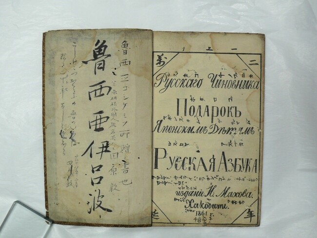 光太夫自筆のロシア文字は所在不明となったものも含めて、現在までに40点ほどが知られており、光太夫の出身地、 三重県鈴鹿市の大黒屋光太夫記念館には、そのうち20点が収集されています。発見されたロシア文字は「イロハ文字」(13 例)や「ツル」(6例)と書かれたものが多く、それに次いで多いのが「福寿」(5例)となります。「福寿」はこれまで4点知られており、今回展示するものは5例目となります。