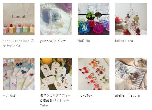 出展店舗:haneul.candle、yuisora、Kuuipo~、happy Life、NeRiNe、felice fiore、∞いちぱ、モダンカリグラフィー&結晶師/ティエト゛ゥールYuko、mokoToy、atelier_meguruなど