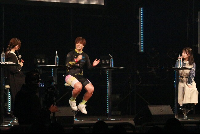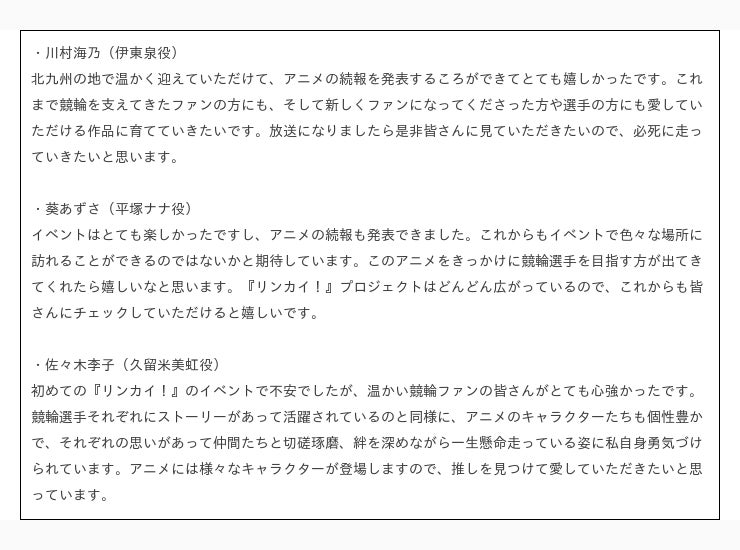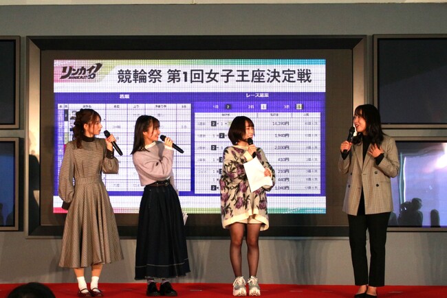 11月26日(日)に実施したイベント「リンカイ!Realきゃんぷ in競輪祭」では、メインキャストの2人に加え、11月14日(火)に発表した新キャラクター・久留米美虹(くるめつつじ)のCVを担当する佐々木李子さんと元女子競輪選手の高木真備さんが登場しました。イベントでは、G1「第1回競輪祭女子王座決定戦」を振り返ったあと、高木真備さんが「年末のグランプリに出場するメンバーが決まったので、これからもっとガールズが盛り上がってくると思います。」と今後の期待を語り、川村海乃さんは「目まぐるしい展開に絶叫し、涙しました。」と感動を言葉にしました。そして高木真備さんは「競輪選手であることの楽しさを実感してきたんですけど、なかなかそういったもの表現している作品はなかったので、これからは『競輪選手を目指したいな』と思ってくれる方が増えるような作品に、またもっとガールズの魅力を知ってもらえるような作品になってくれたらいいなと期待しています。」とコメントしました。